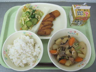 発芽玄米入り御飯、豚肉と大根の煮物、えびかつ、ミックスサラダ、コーヒー牛乳