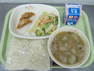 ごま味噌ラーメン、揚げギョーザ、春雨サラダ、牛乳