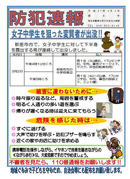 今回は、「女子中学生を狙った変質者出没」に関するものです。特に、新座市内