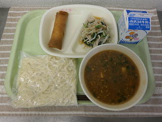 麻婆ラーメン 春巻き もやしのナムル 牛乳