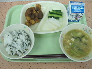 30日の給食 豚肉とレバーのゴマダレ