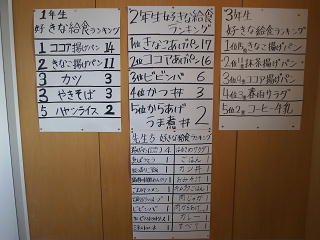 給食集会で発表した、各学年と先生方の給食ランキングです。 揚げパンが大人気です!!