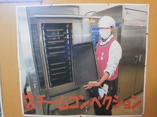 これも、給食集会で紹介した給食室にある調理器具です。 この回転釜1つで、全校分の汁物や焼きそば、スパゲッティなど 作ります。 スチームコンベクションでは、肉や魚、ケーキなどを焼いたり 蒸したりするときに使います。 |