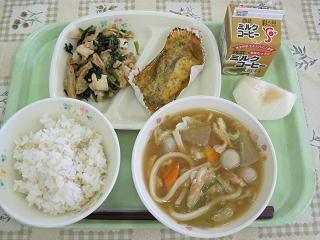 打ち込み汁、まんばのけんちゃん、発芽玄米入り御飯、魚のピリ辛マヨネーズ焼き、ナシ、コーヒー牛乳打ち込み汁・・・季節の野菜をふんだんに使い、うすい味噌ベースの煮込みうどんです。畑仕事から帰ってすぐに支度のできる主婦の味方、農村の日常食です。