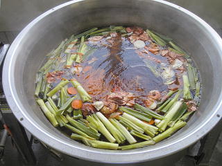 野菜の葉でだしをとります。しょうがとにんにくのいい香り♪野菜をこしてスープに入れます