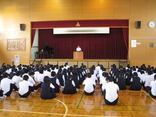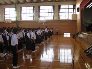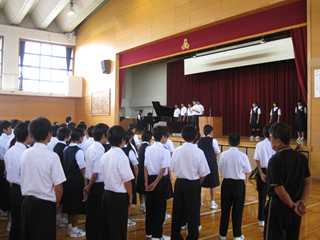 本日、体育館で全校朝会を行いました。朝会の前に、恒例の「全校校歌練習」を生徒会本部を