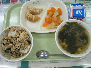 ビビンバ 揚げ餃子 わかめスープ根菜のピリット漬け 牛乳今日の給食は3年1組さん、3年2組さんのリクエスト給食です。一番多かったリクエストはビビンバでした。実は・・・1月の献立にも3年1組さんと3年2組さんのリクエスト給食のビビンバがあったのですが、両クラスともインフルエンザで学級閉鎖になってしまったため、再度登場しました。残りもとても少なかったです。