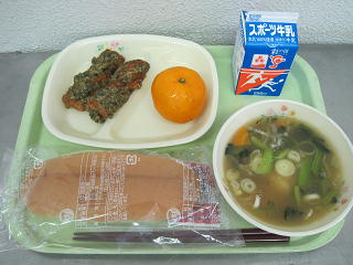 コッペパン、ジャム、すいとん、竹輪の石垣揚げ、冷凍みかん、牛乳