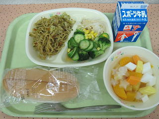 コッペパン 焼きそば コーンサラダ フルーツポンチ 牛乳
