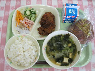 勝つ丼、春雨サラダ、大根とあさりの味噌汁、牛乳、チョコペストリー
