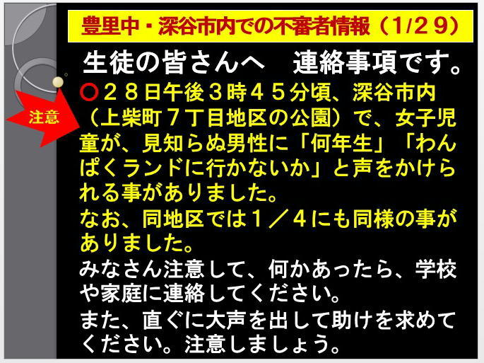 市教委より不審者情報がまいりました。今回の件は、今月4日に同地区で同様の不審者が出没しています。不審者の情報が続いていますので、御家庭でも、御指導をお願いいたします。