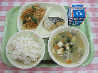 発芽玄米入り御飯、鰆の西京焼き、切り干し大根の炒り煮、野菜椀、牛乳