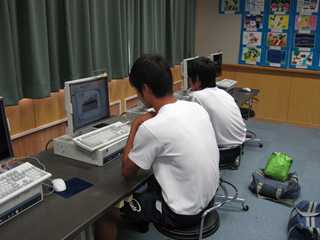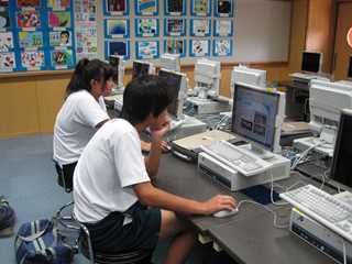 本校でも、現在その説明資料づくりを行っています。パソコン室で生徒会本部の人たちが、