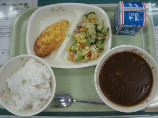 ハヤシライス オムレツ メキシカンサラダ 牛乳