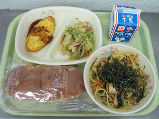 パインパン、和風スパゲティー、ポパイチーズオムレツ、春キャベツのサラダ、牛乳