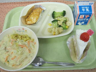 カレーピラフドリア風 チキンのフレーク焼き 花野菜サラダ お祝いケーキ 牛乳