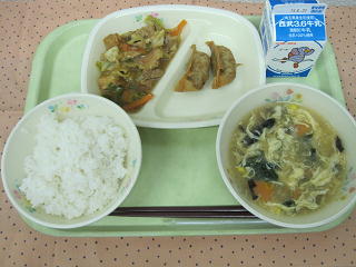 白飯 回鍋肉 揚げ餃子 卵スープ 牛乳