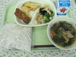 肉うどん かぼちゃと竹輪の天ぷら 鉄分サラダ 牛乳
