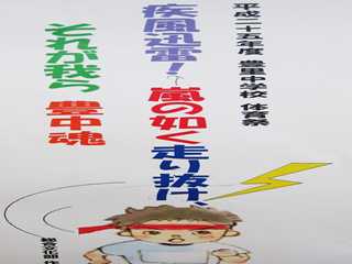 「疾風迅雷 嵐の如く走り抜け それが我ら 豊中魂」を大きな白い布に描い