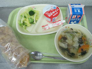 きな粉揚げパン ワンタンスープ グリーンサラダヨーグルト 牛乳今日から給食がスタートしました。最初の給食は、みなさんが好きな、きな粉揚げパンです。1年生のみなさんは、大きいパンに驚いたでしょうか。2,3年生は残りがほぼゼロでした。さすがですね。給食には、成長に必要な栄養がバランスよく含まれています。好き嫌いせず食べましょう。