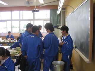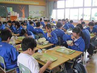 ココア揚げパンをじゃんけんする生徒たち 2年2組さんの給食の様子