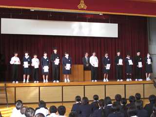 本日(29日)の全校朝会は、生徒会本部役員と学級委員の任命式を行いました。