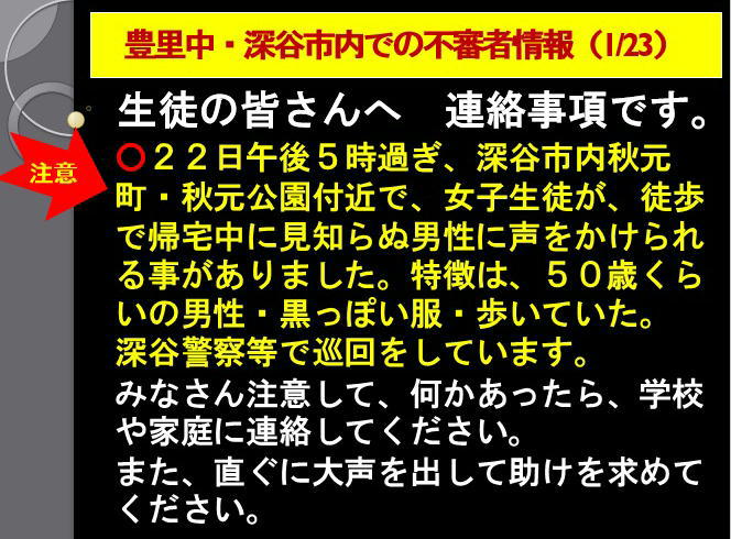 本日、市教委より不審者情報がまいりました。学級でも注意するように指導いたします。さて、20日にも不審者情報がありましたが、ここ最近、同様の情報が多くありますので、御家庭でも、御指導をお願いいたします。