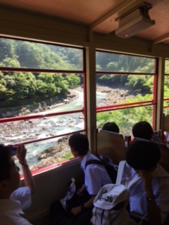 修学旅行の最終日は、トロッコ列車で嵐山駅まで移動します。天気も最高です。