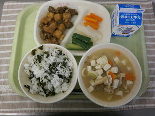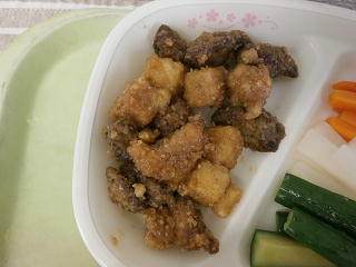 豚肉と鶏レバー、高野豆腐を使った料理です。レバーが苦手な生徒も