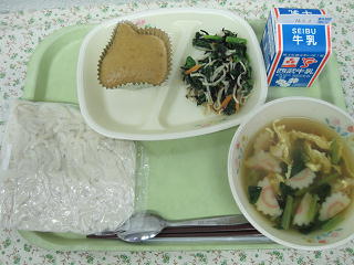 たまごとじうどん 黒糖パンケーキ ほうれん草のサラダ 牛乳