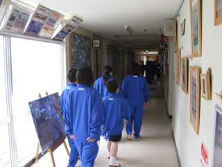 豊里中学校の各教室や施設設備についてのオリエンテーションを兼ねて、各班毎にチームで回りなが