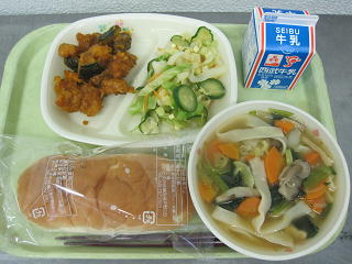 パインパン、煮ぼうとう、鶏肉とかぼちゃのオレンジ煮、ミックスサラダ、牛乳