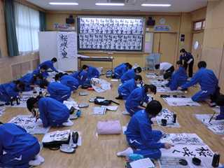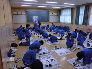 今回は、1年生・国語の「書写」の授業です。例年この時期は、市・県の書き初め展も予定されていて、各学年でそれぞれの手本を元に、授業を行っています。本校では、多目的室を利用して、生徒が一生懸命に取り組んでいます。静かに集中できるように、お互いで協力しています。筆を走らせる音が、室内に響いていて、「がんばっているな」と思います。まさに、「作品には魂がある。」ですね。