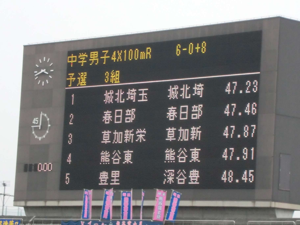 県新人体育大会兼県民総合体育大会の陸上競技が、熊谷スポーツ文化公園の陸上競技場で(13/14日)行われています。豊里中からも、個人種目とリレー種目にエントリーして、すばらしい競技場で「全力」出してくれています。全県からそれぞれの地区で記録を出してきた選手たちとともに競っている姿は、