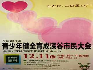 平成23年度青少年健全育成深谷市民大会が、深谷市民会館で開催されました。当日は、中学生の主張・アトラクション(深谷中吹奏楽部)・「手紙でつむぐ・ありがとうの手紙」の表彰などが行われました。中学生の主張では、市内10校からの代表者のみなさんが、しっかりと自分の意見を発表してくれました。