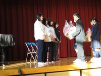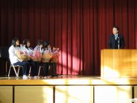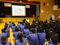 まず、給食委員により、給食調理場の1日の様子がスライドで紹介されました。朝早くから調理員さんたちが様々な準備をし、衛生的にも安全で美味しい給食が作られる様子がとてもよくわかりました。次に、調理員さんから実際の調理についてや、生徒の皆さんがよく食べてくれることからやりがいを感じていることなどのお話をいただきました。その後、校長先生から1年間の給食室の様子や調理員さんの仕事に関するお話がありました。