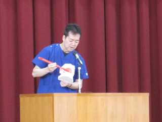 本日(9日)、本校の学校歯科医の河田典雅先生に、朝会時に歯科講話をして