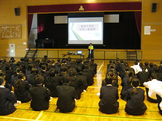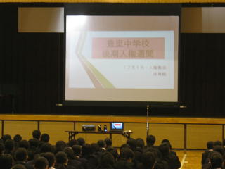 今朝の全校朝会は、人権集会を行いました。生徒の作文発表、学校長の