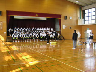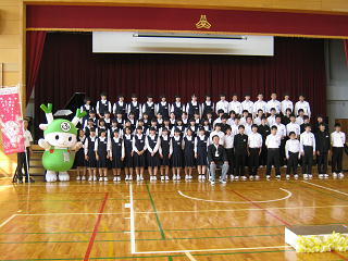 学年合唱で市長さんを迎え、ふっかちゃんと市長さんと記念撮影後