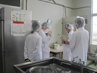 給食室の中もチェックしていただきます。湿度や温度の確認、掃除が行き届いているか、
