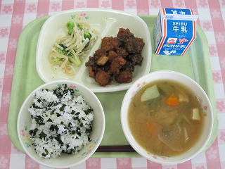 わかめ御飯、豚肉と高野豆腐のごまだれ、温野菜、野菜椀、牛乳