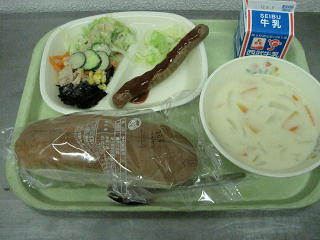 ホットドッグ 白花豆のポタージュ ツナとひじきのサラダ 牛乳白花豆はいんげん豆の一種です。白色の大きな花をたくさん咲かせるため、それが名前の由来となりました。現在は主に北海道で作られ、一部は東北地方や長野など、寒い地域で栽培されています。
