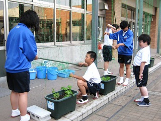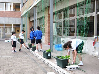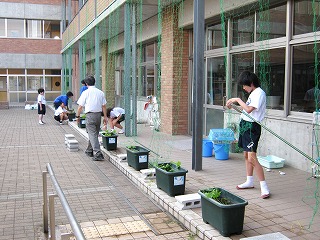 6月5日(水)教室前の中庭に、ゴーヤの緑のカーテンを総合文化部の生徒を中心に設置しました。スクスク成長して、涼しい学習環境を提供してくれるといいですね。