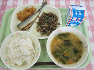 発芽玄米入り御飯、さんまの塩焼き、大根おろし、こんにゃくとしめじのピリ辛炒め、野菜椀、牛乳今日は、豊富な秋の味覚の中でも代表的な、「さんま」です。
