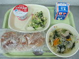 アーモンド揚げパン、わんたんスープ、ほうれん草と卵のソティ、元気ヨーグルト、牛乳本日は、給食試食会が開催され、13名の参加がありました。