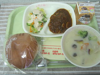ハンバーガー オータムシチュー 三色サラダ 牛乳