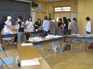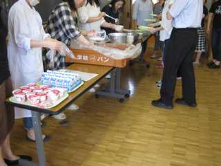 実際に、配膳作業を分担して頂き、盛りつけ等を体験してもらいました。試食の感想は、皆さん「おいしかった。」
