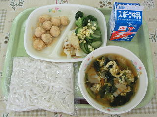 玉子とじうどん、お月見白玉団子、ポテトのさっぱりサラダ、牛乳