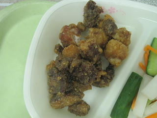 本日の給食 豚肉と鶏レバーと高野豆腐のゴマダレ