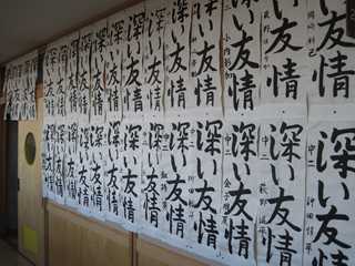 現在、各学年の生徒全員が書いた書き初めを廊下に掲示しています。